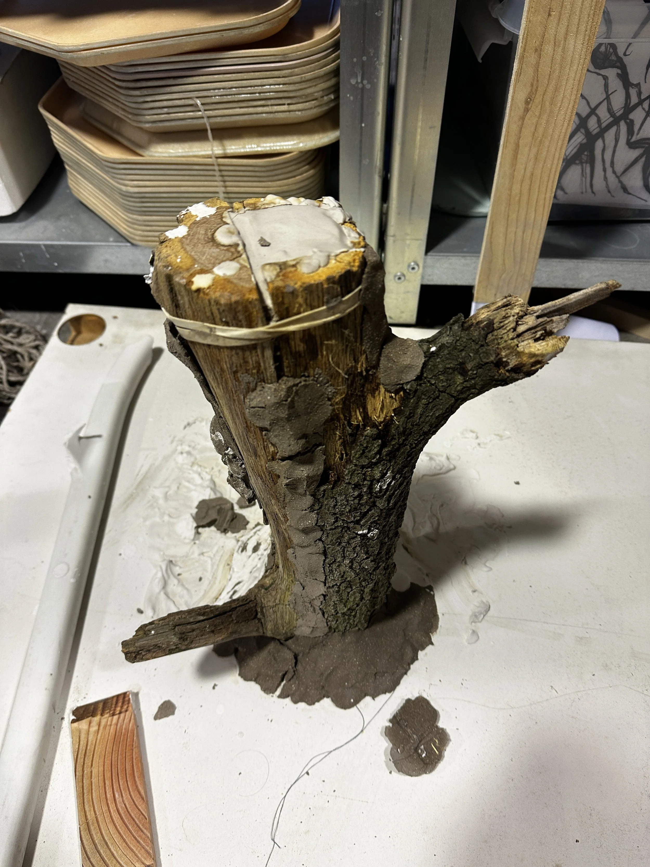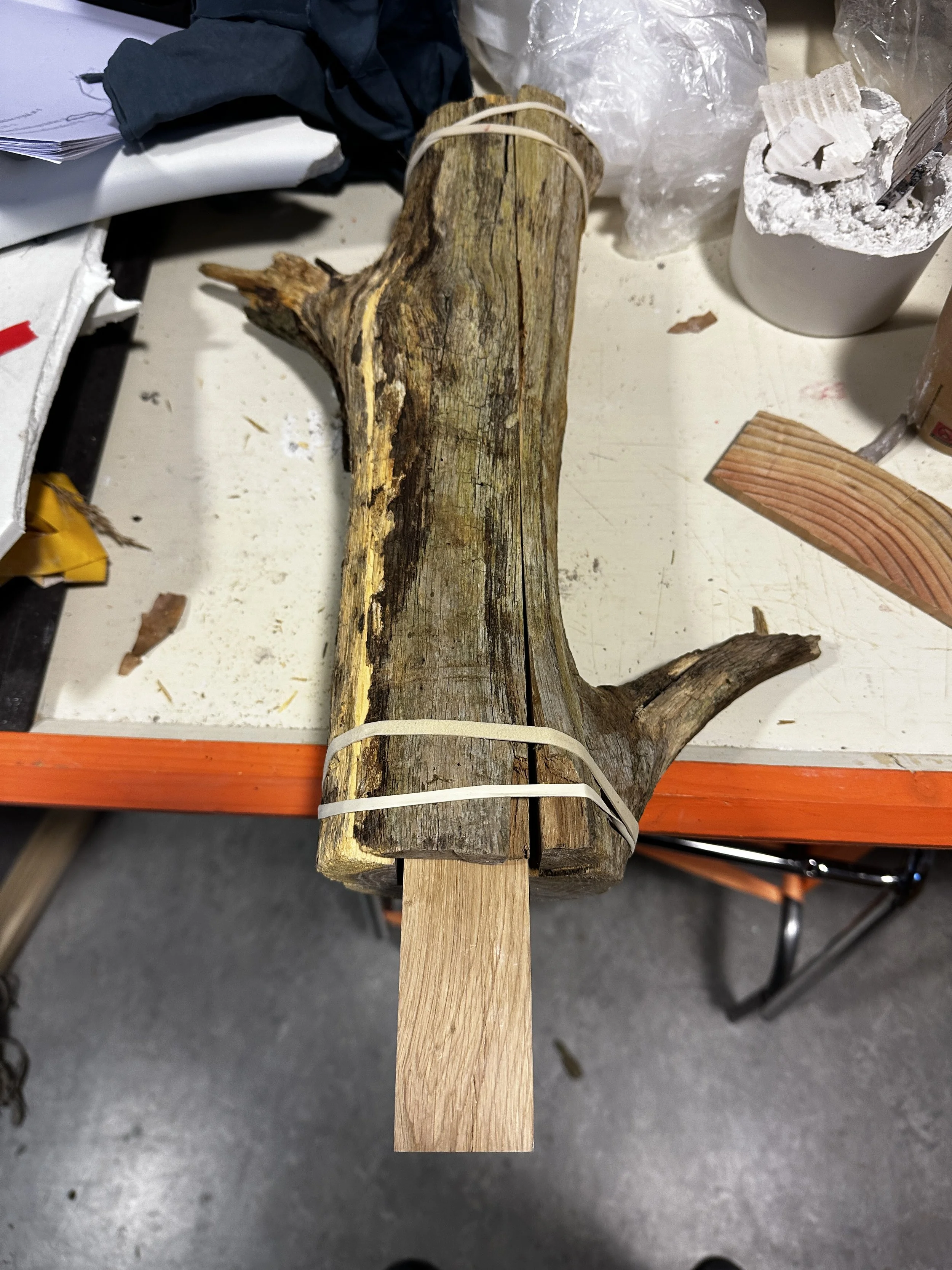 I decided to change the form of tree into a cuboid, which is about making a denatured from. In my initial ideas, I thought now wood cuboid became copyable as a mold. Then, I can produce the form of the tree. However, when I tried to copy that form with plaster after that, I saw that the actual form changed on the plaster, because the space inside the log changed after losing attention by cutting, I am seeing the wood with certain attention inside in that moment.