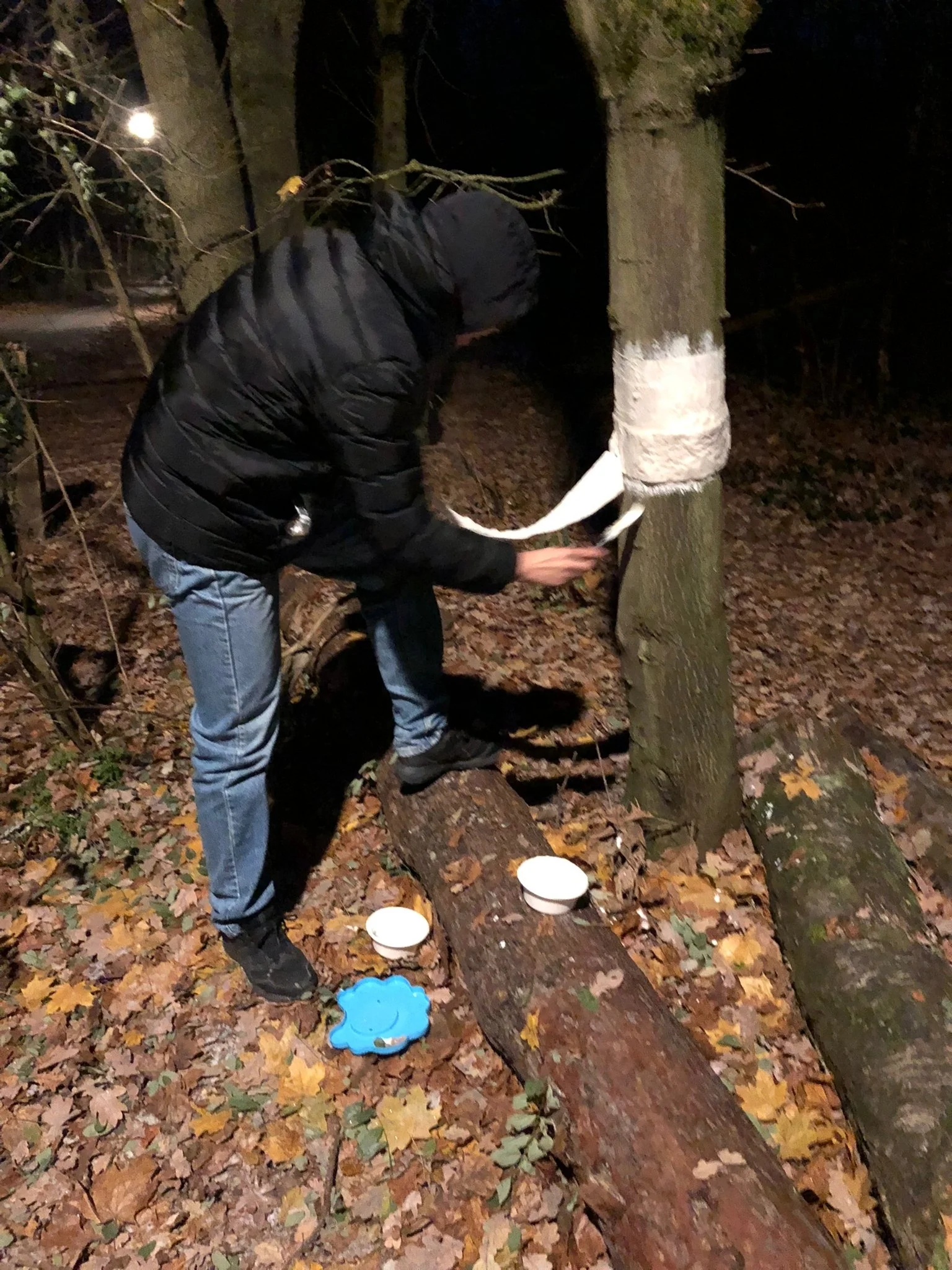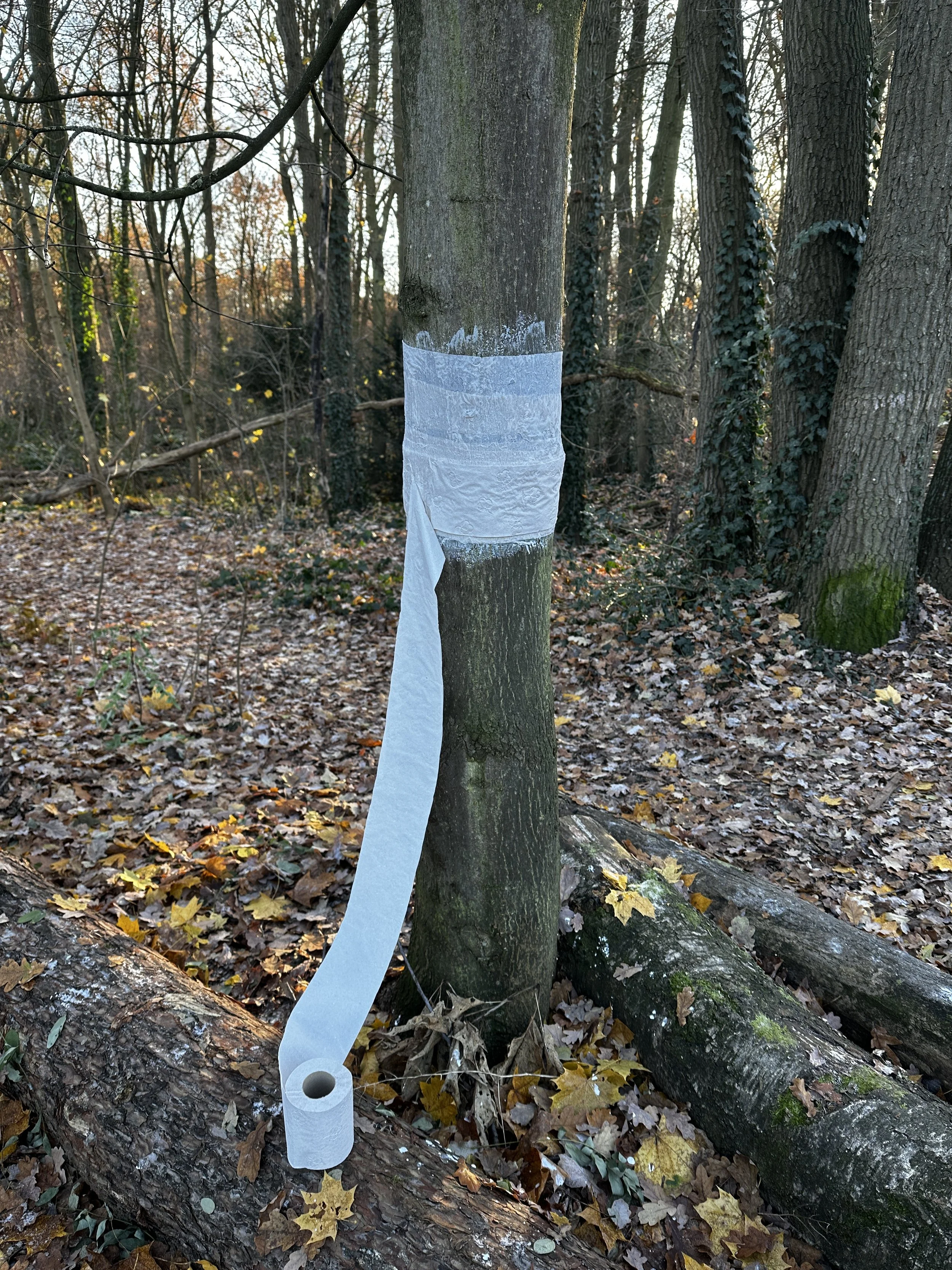I am trying to understand the importance of the position of a tree by wrapping toilet paper on it, in order to remember the form of the tree, It took 3 hours to finish a whole roll.
