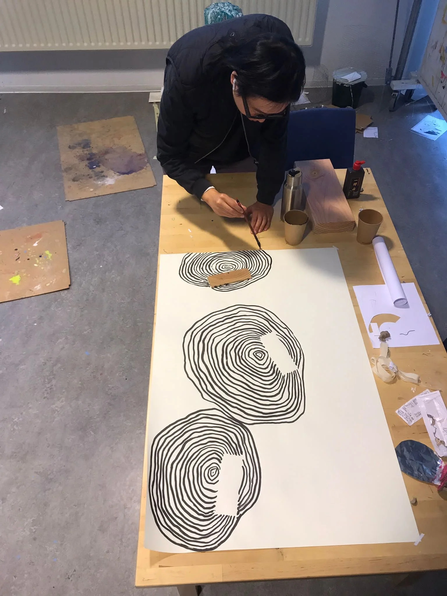 It is a drawing I made in the wood workshop during my exchange in Netherlands, one day, I was picking some planks to make something, but I did not know what to make, without any plans, I stuck in front of the plank shelf. Suddenly, I saw a very clean grain from one of planks, it is beautiful, I felt I saw the tree behind that, I was wondering where is that beauty from, is it from the tree? Also, I realized that I never saw a plank from the tree perspective before.